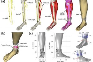 概述 足部的触觉在提供地面信息方面发挥着重要作用。足部感知到的触觉在站立时会根据地面条件而不同,因此足部触觉的呈现对于营造沉浸式虚拟现实体验至关重要。本研究提出一种多电极踝部神经束电刺激方法,通过在踝关节放置电极产生足底与足背表面触觉的分布,并采用有限元仿真验证电极放置的有效性。 模拟 图像处理 获取基于 MRI/CT 扫描数据获得的包含超过 1200 个部位的实体 3D 男性模型,导入 Simpleware 软件进行图像处理。在 Simpleware ScanIP 模块,通过裁剪仅保留右下肢区域,使用 Paint 和布尔运算工具填充原模型中存在的非自然间隙。将血管内部的填充空隙定义为血液域,皮肤表面内的其他空隙则为内部组织域。在 Simpleware CAD 模块,将 24 个阴极与 3 个阳极放置在皮肤上。下肢模型中共包含 9 个不同的域,即电极、神经、软骨、血液、血管、肌肉、骨骼、皮肤及内部组织。在 Simpleware FE 模块,同时为以上部位生成高质量的四面体体积网格模型(含四面体单元 2118555 个),设置以 NASTRAN 格式导出。 图:(a)模型中的域(B)主要踝神经的位置(腓神经、腓肠神经、胫神经)(c)导入 COMSOL 的模型 将网格模型导入 COMSOL 软件,使用 AC/DC 模块计算电流密度分布。边界条件:(1)向阳极暴露表面施加内向电流(2)将阴极暴露表面设为接地(3)其余所有外表面均视为绝缘体(4)根据每个电极的外表面尺寸,将各电极的内向电流密度定义为合适值以提供 3.0 mA 的电流值。 图:电极放置和不同的电刺激条件 模拟结果 在电刺激条件①、②和⑫下,沿踝关节前侧走行的腓神经在三条神经束中呈现最高的电流密度值。在条件③-⑦下,沿踝关节内侧走行的胫神经具有最高的电流密度值。在条件⑧-⑪下,沿踝关节外侧走行的腓肠神经显示出最高的电流密度值。 图:每个电刺激条件下的电流密度分布 对支配足底与足背区域的神经束进行刺激,主要受刺激的神经束随电刺激条件的不同而变化,这表明所提出的方法可能选择性地在足底和足背表面的特定区域诱发触觉。在不同电刺激条件下,每个神经束获得的电流密度分布也不相同。 图:每个域中的最大电流密度 用户研究 在实验中,21 名参与者使用三种 VR […]