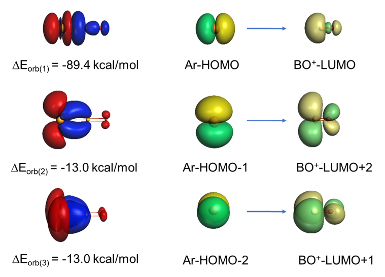 自从 1962 年加拿大化学家 N. Bartlett 首次合成氙化合物 XePtF6 以来,化学家们在氙、氪等重稀有气体化合物的合成与结构表征方面取得了显著进展。然而,由于轻稀有气体氦、氖和氩具有更稳定的价层电子结构,其化学性质相对更为惰性,因此更难形成稳定化合物。对于氩而言,HArF 是目前已知的唯一一个在低温稀有气体基质中能够稳定存在的含氩中性化合物。尽管氩表现出高度惰性,但它仍可作为 Lewis 碱与强Lewis酸(如BeX (X = O, S, CO3), MX (M = Cu, Ag, Au, X = F, Cl, Br, O), CUO)等形成配合物,通常表现为较弱的给体-受体相互作用。近日,复旦大学周鸣飞教授团队与德国马德堡大学/南京工业大学的 Gernot Frenking 教授合作,发现 BO⁺ 离子作为强 Lewis 酸,与氩原子形成了ArnBO⁺(n=1-3)配合物。结合AMS的 EDA-NOCV 分析表明,最简单的ArBO⁺离子中,Ar-B键具有很大的键能,存在多重键特性。