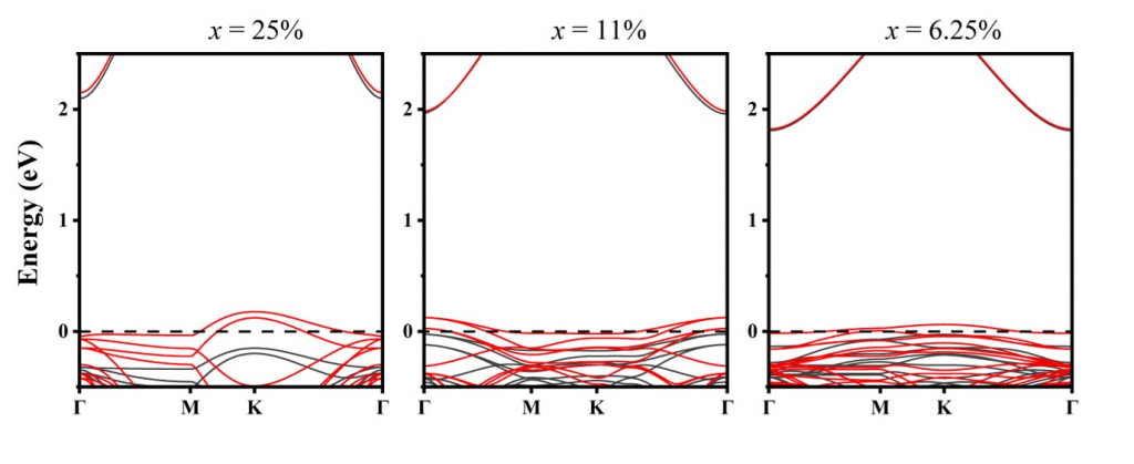 既然吸附/掺杂浓度通常会影响材料的电子结构,我们也研究了插层浓度对F-Ga2N2半金属性质的影响。当体系的插层浓度从前述100%降低到25%、11%和6.25%时,从图3可以看出插层体系的半金属性一直存在。