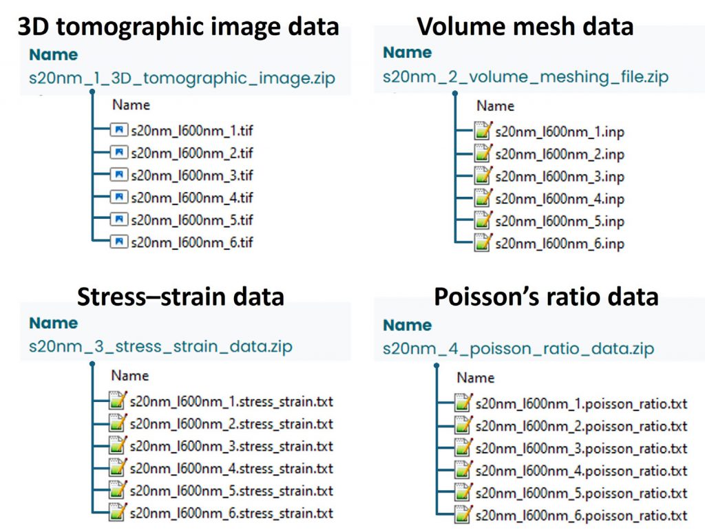 数据集中包含四种主要数据类型:(1)实验制备 NPG 的三维断层扫描重建图像文件(2)基于断层扫描数据生成的体积网格模型文件(3)通过有限元模拟获取的力学响应数据,包含应力-应变行为和泊松比(4)NPG 试样的结构与力学性能汇总表。