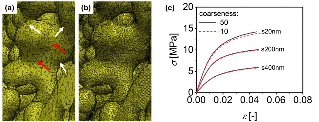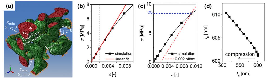 基础材料为由脱合金工艺制备的纳米多孔金,固体分数约 0.30,韧带尺寸范围是 20-400 nm。使用 Simpleware 软件对 FIB/SEM 图像数据进行重建,获取纳米多孔网络的比表面积、固体体积、固体体积分数等结构参数,评估三维微观结构的连通性。在 Simpleware FE 模块生成体积网格模型后导入 Abaqus 软件,分别沿三个主轴方向进行单轴压缩下的力学响应评估,根据所得应力-应变曲线确定每个结构的杨氏模量与屈服强度。由真实应变增量分析弹性与塑性泊松比。