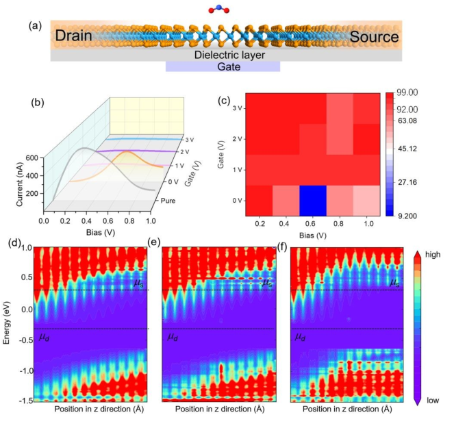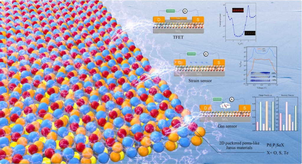 在现代纳米器件领域,获得高开关性能并在高精度环境中实现传感检测功能至关重要。二维(2D)Pd2P2SeX(X = O、S、Te)具有优异的几何、物理和化学特性,可以结晶成具有间接带隙的正交结构。基于这些基本特性,通过第一性原理对二维 Pd2P2SeX pin 结器件进行建模以模拟场效应晶体管、高开关比应变传感器和基于化学吸附的气体传感器。Pd2P2SeX pin 结器件表现出显著的栅极电压电流控制能力,Pd2P2SeO 的电流变化幅度接近三个数量级。此外,施加双轴应变可关闭 Pd2P2SeX 的带隙并显著增强传输特性,从而在器件中产生巨大的开关效应,例如 Pd2P2SeS 的开关比为 1.44 × 108。NO 和 NO2 的化学吸附产生了界面电子耦合,产生了跨越费米级的杂质带,从而诱导了从半导体到金属的转变。基于 Pd2P2SeO- 和 Pd2P2SeS 的pin结器件在检测 NO 和 NO2 时的恢复时间分别为 49.01 秒和 23.80 秒。因此,它们可用作高灵敏度和高选择性气体传感器。总之,二维 Pd2P2SeX 材料在开发低维电子器件方面具有巨大潜力。