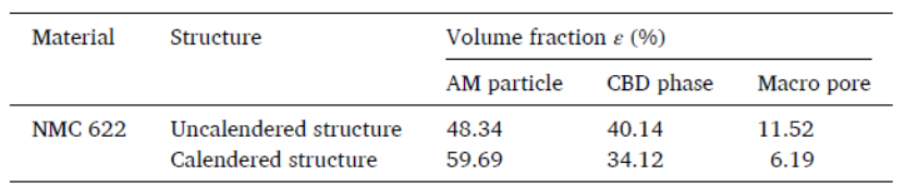 电极结构由 96 wt% LiNi0.6Mn0.2Co0.2O2(NMC622,BASF)、2 wt% C65 炭黑(Imerys)和 2 wt% PVDF(Solvay)配制,使用带有 MTI MSK-HRPMR100DC 压延设备的辊压机将干燥的电极压延两次。通过 XCT 对阴极结构进行表征,采用未压延结构和压延结构与 DEM 预测进行比较。使用基于机器学习的图像分析工具 Ilastik 预测扫描图像中不同相的体积分数,即 AM 颗粒相、CBD 相和宏孔相。